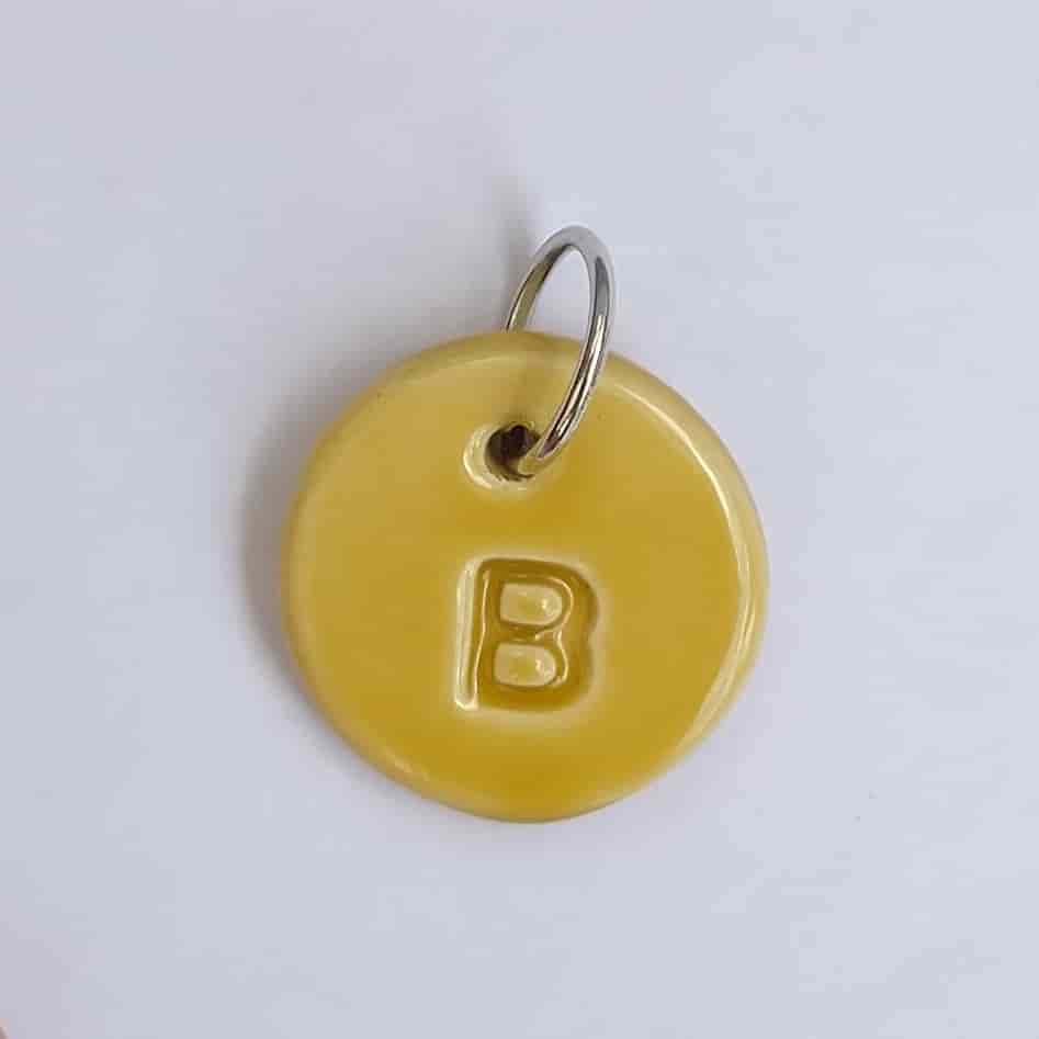 Ceramic charm with letter, supplied with metal ring.  Approximate diameter of each charm: 20mm.